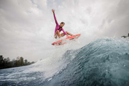 Surfer on red surfboard ride on blue wave. Surfing in the ocean