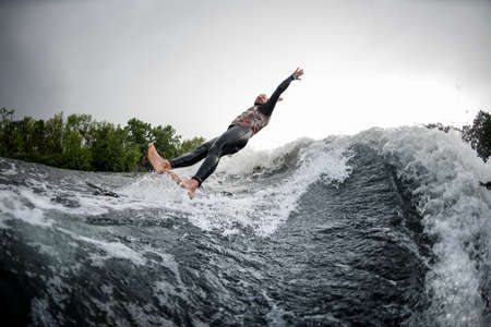 wakeboarder in action, with a spray of water around him, created with generative ai