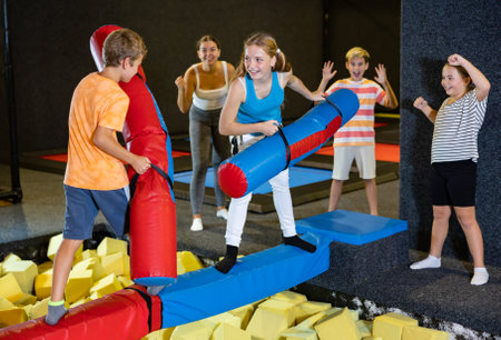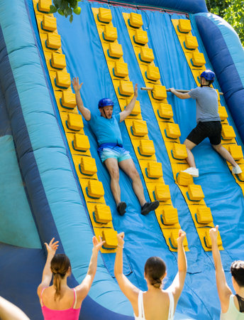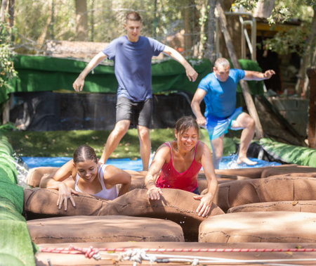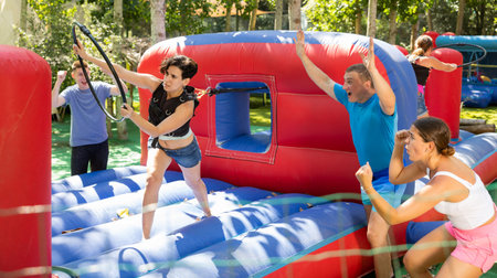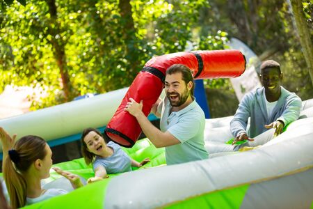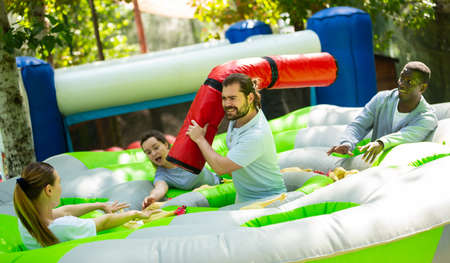 Group of enthusiastic men and women passing obstacles and having fun on inflatable arena at amusement park