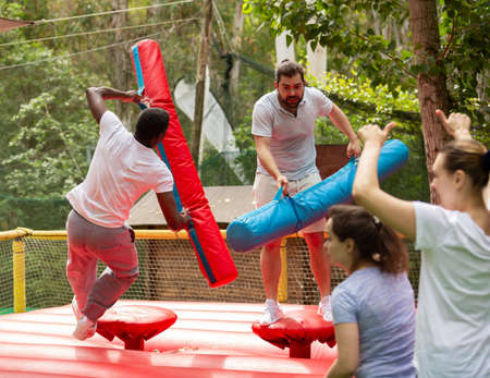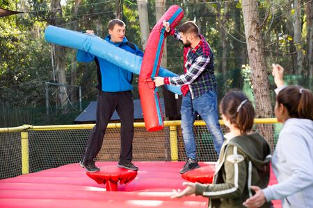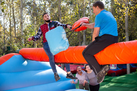 Smiling adult men having funny wrestling by inflatable logs in outdoor amusement park