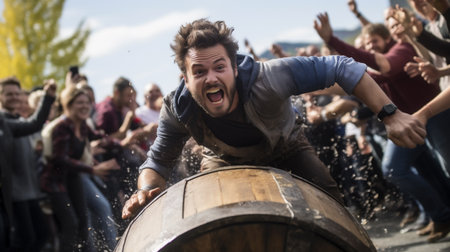 Group of friends having fun and playing with wooden barrels. Octoberfest concept