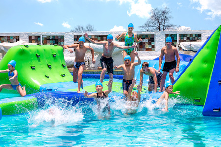 Group of kids having fun on inflatable air mattress in swimming pool.