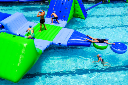 Water slide amusement park tourist attraction summer kids festivity festival joy pool with blue clear water vacation leisure time aquapark fast sliding pipes colorful resort entertainment center