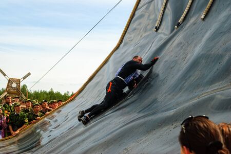 Tyumen, Russia - June 11, 2016: Race of Heroes project on the ground of the highest military and engineering school. High wall stage. Sportsman storms wall