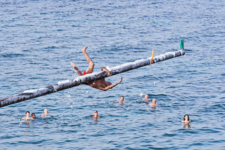 Xghajra, Malta - August 3, 2019: Traditional Maltese game of Gostra, where is Brave local men would try to run up pole and reach one of symbolic flags at top in order to claim prize