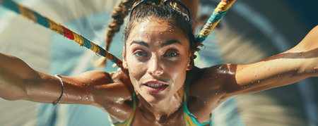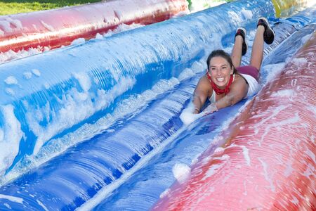 pretty woman smiling sliding down in water slide in mud run obstacle course race happy enjoy
