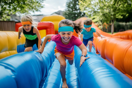 Children running and having fun on a colorful inflatable obstacle course in a backyard during a sunny summer day