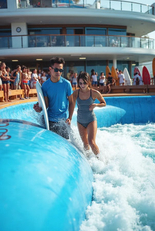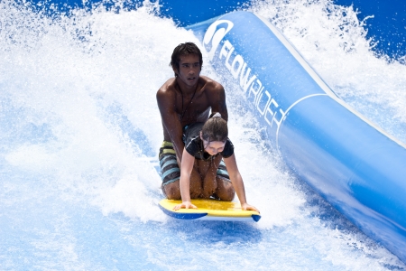 Beautiful young woman surfing on a wave simulator at a water amusement park