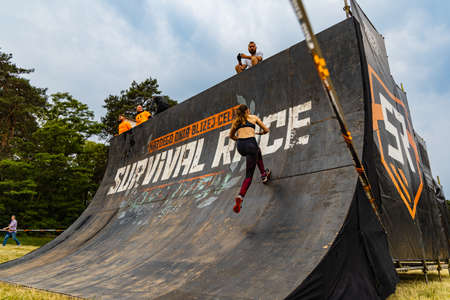 Poznan, Poland - June 2021: An hard extreme obstacle course Survival Race at rainy day