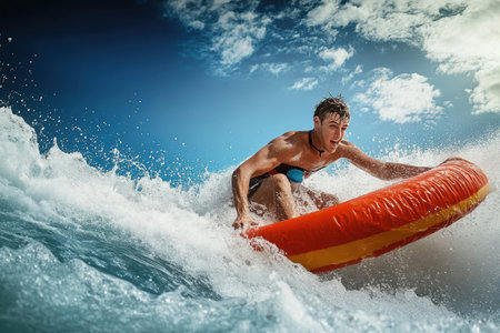 A young man skillfully maneuvers a bright flotation device while surfing waves under a clear blue sky.