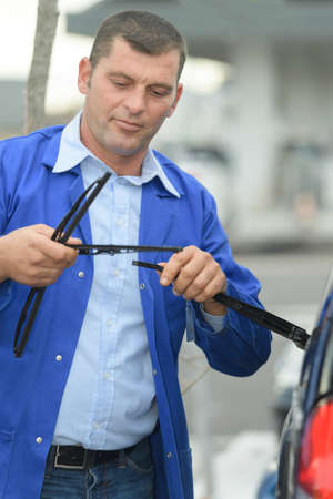 Male auto owner checking windshield wiper at the street. Man is changing windscreen wipers on a car. Automobile repair concept