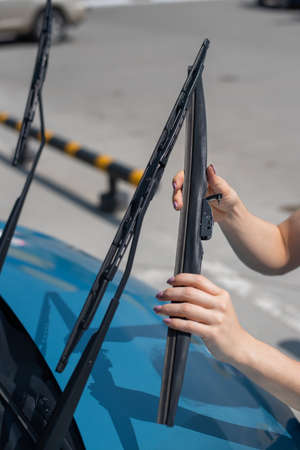 Close up of female hands changing windshield wipers