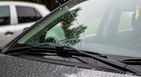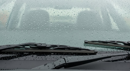 A close-up view of a car's windshield wiper blade in motion, effectively removing water droplets from the glass surface.