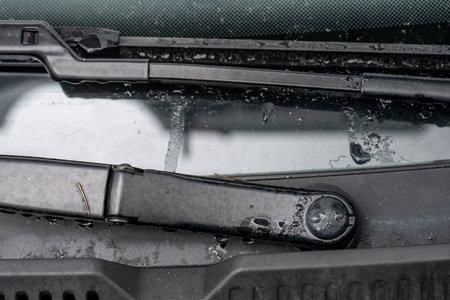 Dirty car windshield wipers with dry mud on front window close up.