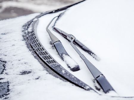 Car wipers covered with snow on a cold winter day