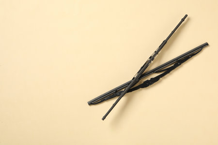 Car windshield wipers on beige background, flat lay. Space for text