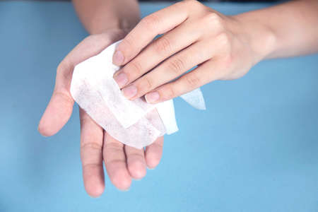 man disinfecting his hands with a wet wipe on blue background