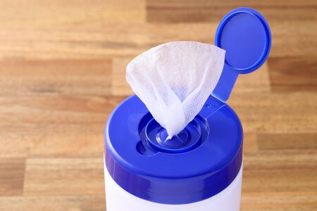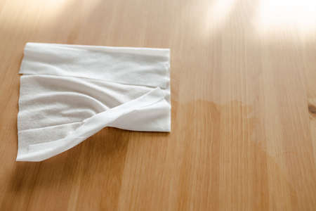 disinfecting surfaces from bacteria or viruses sill-life, hand cleaning woooden coffee table with disinfectant wet wipe concept of the new normal after covid-19