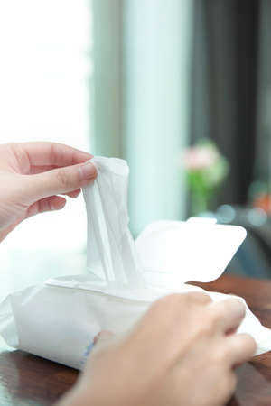 Young woman open package of antibacterial wet wipes to cleaning hands