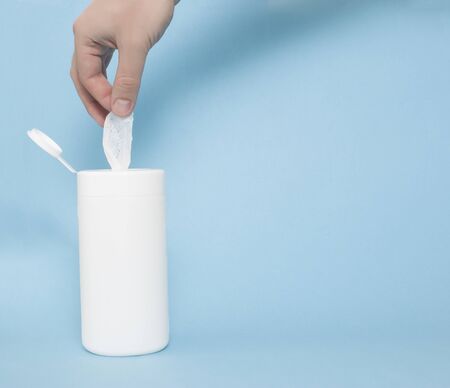 A man hand takes out a wet towel for cleaning and disinfection on a blue background, copy space. Hygiene and sanitation, prevention against infections and microorganisms, hypoallergenic