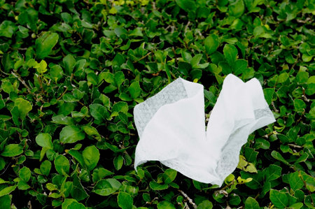 Used sanitary napkin on green leaf background, protection against pollution