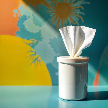 Summer cleaning supplies. White sanitizing wipes container against artistic beach sunset backdrop with decorative sun rays.