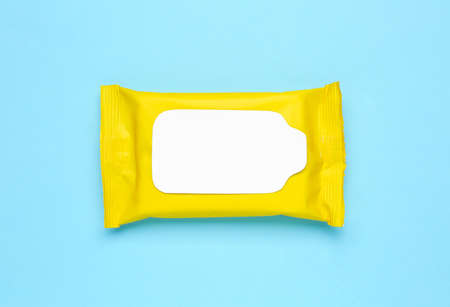 Wet wipes flow pack on light blue background, top view