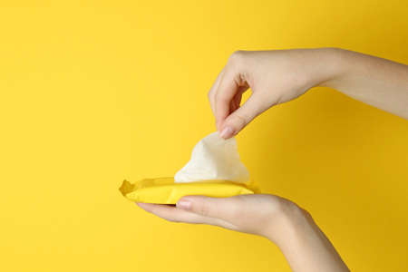 Woman taking wet wipe from pack on yellow background, closeup. Space for text