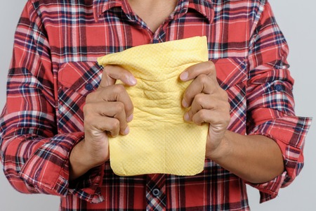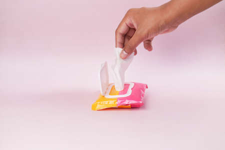 Hand holding wet wipes tissue on white background