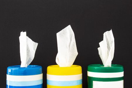 A close up of disinfecting wipes on a black background