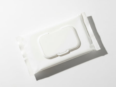 This image features a packet of wet wipes placed centrally against a white background. The packet is rectangular with a flip-top lid, and the wipes are visible through a transparent section of the packaging. The image is well-lit, highlighting the clean and simple design of the packet. Ideal for use in product listings or advertisements.