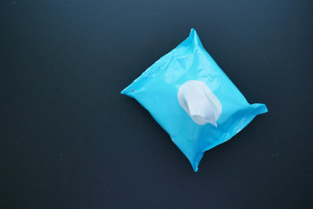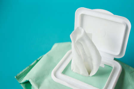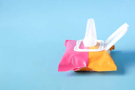Cleansing wet wipes on blue with copy space