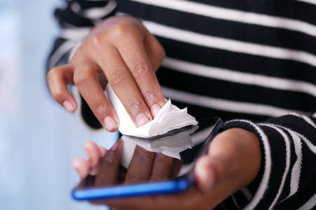Woman wiping mobile phone with a napkin
