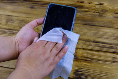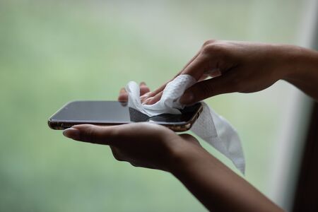 Person Cleaning mobile phone screen with disinfecting wipes for clean smartphone. COVID-19 Coronavirus outbreak contamination prevention concept.