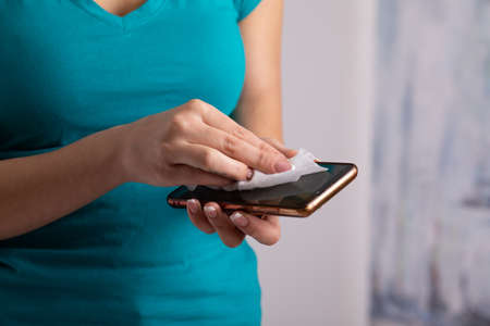 COVID-19 Pandemic Coronavirus Woman disinfecting cleaning mobile phone screen preventive wiping for SARS-CoV-2 Coronavirus disease 2019 outbreak contamination prevention