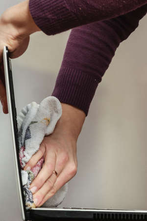 Technology, computers and household. Cleaning home chores. Woman gentle clean screen of laptop with cloth.