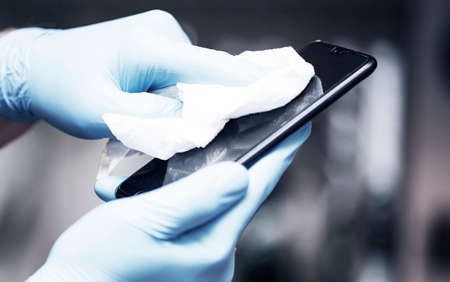 A hand in a medical glove with a disinfectant napkin wiping dirt from the surface of a smartphone. Copy space - concept of cleaning equipment, cleanliness, spread of coronavirus, prevention.