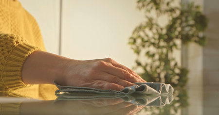 A person is meticulously hand cleaning a surface using a cloth in a bright and inviting environment
