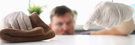 Focus on gloved hand of diligent male touching white office workplace and holding brown loincloth and swiping dust with harmful germs. Pleasant clean-up concept. Blurred background