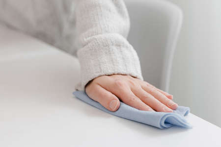 Cleaning the table with a blue microfiber cloth. Sanitize surfaces prevention in hospital and public spaces against coronavirus. Woman hand using wet wipe at home. Cleaning the room