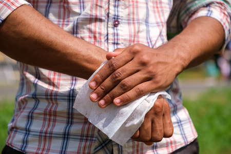 close-up hands of afro-american man using a antibacterial wet napkin wipe.