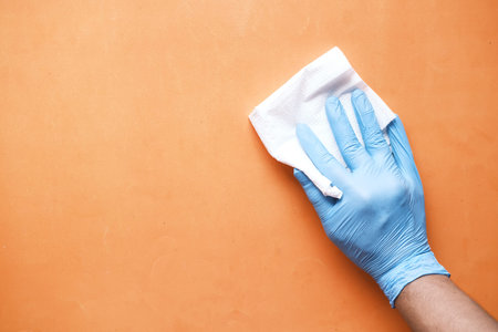 A hand in a blue rubber glove wipes the dust of a pink rag from a white plaster surface, copy space.