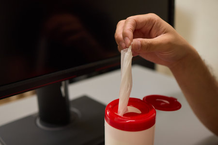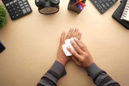 Close up hand a man cleaning and disinfection of workspace. Disinfecting wipes to wipe surface of desk , laptop, mouse at office. Stop the spread
