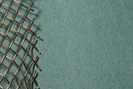 A closeup of a copper mesh on a green craft paper background with space for your text