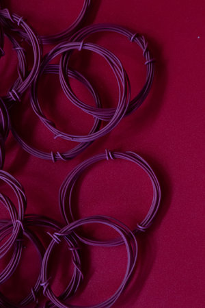Purple rubber bands on a red background. Close-up.
