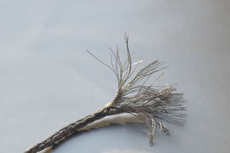 The end of the stranded cable is clamped in wire cutters. A piece of braid lies next to the table. Side view. Close-up. Selective focus.
