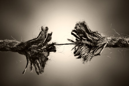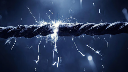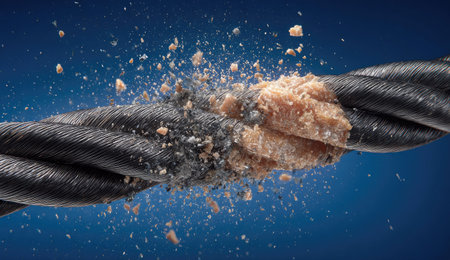 A close-up shows a thick, metal cable fragmenting against a dark blue backdrop. The image highlights the breaking point of the cable with textured particles. The lighting creates a sense of depth and contrast, emphasizing the tension. This image could be used for various commercial and editorial purposes.
