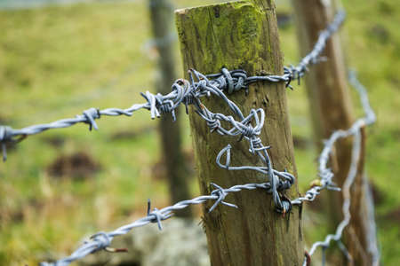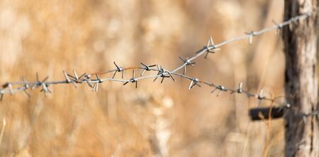 barbed wire with blurry field background, selective focus