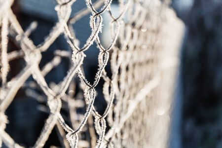 Fence of metal mesh covered with frost. The sun shines early in the morning on the frozen grid. The concept of freedom behind a frozen metal mesh under the light of the sun. Cold winter morning.