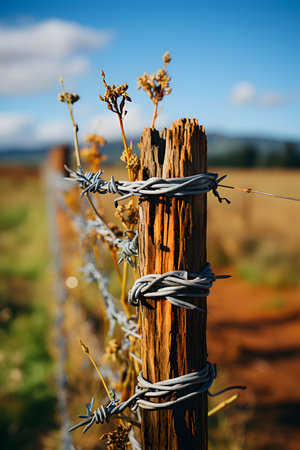 AI Generated. Barbed wire fence in rural landscape with copy space